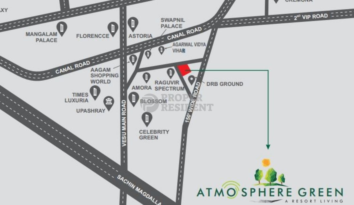 Atmosphere Green has 13 floors per tower. Total 5 towers are there. It offers 3 & 4 BHK modern flats at Vesu, Surat.
